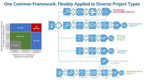 Example 3: Another company refreshed their five-stage innovation process by introducing a three-stage and two-stage process for more flexibility. The five-stage remains for large and complex projects with high risk. The incremental low risk projects are put through a three-stage process, while a two-stage process is now used for simple change request orders from the sales force. This revised multi-routing for projects enables more speed and lower costs for lower risk projects while ensuring that higher risk projects still receive the level of rigor they require. This approach also permits better utilization and targeting of scarce resources.