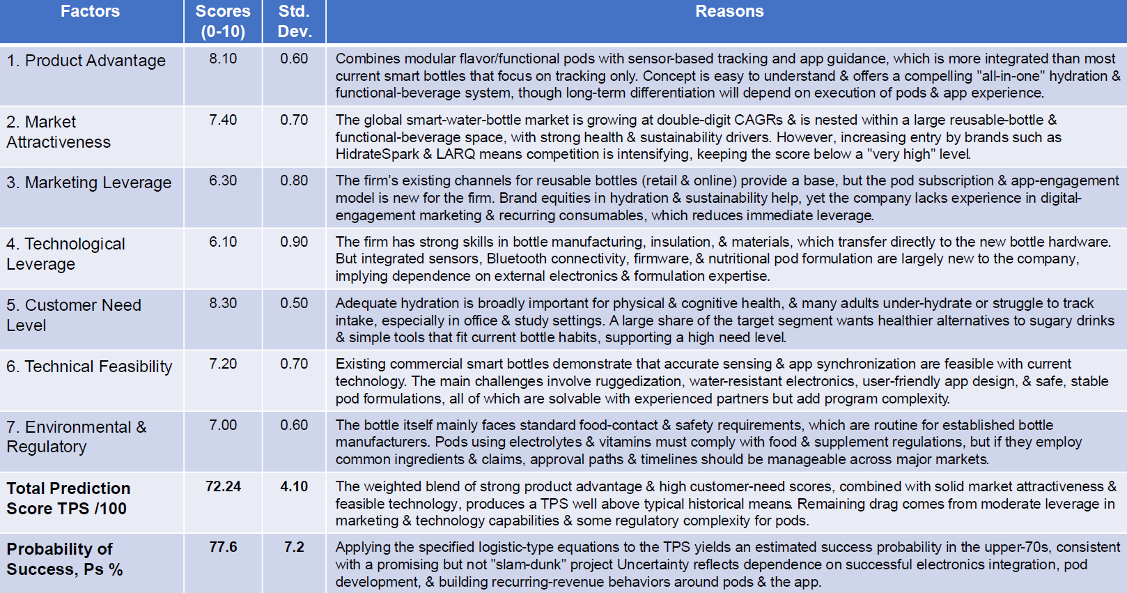 The project team submitted their preliminary business case, including market, technical, and financial analyses, to AI-PRISM for evaluation. AI-PRISM analyzed the submission, sourcing external data to fill information gaps. It scored the project on the 20 sub-factors, determined the seven factor scores, and generated a total prediction score out of 100. Algorithms then converted this score into a probability of commercial success (see Table 1).