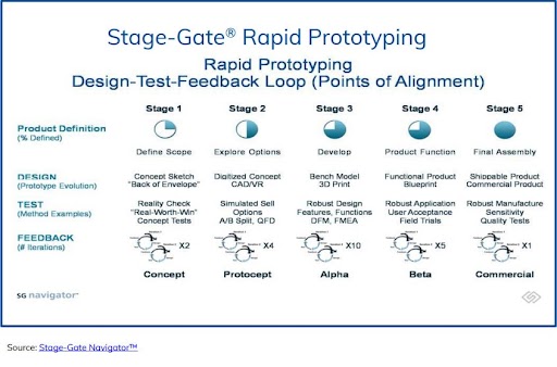 In Agile, one of the primary goals behind producing ‘working software’ in every sprint is to ensure the team avoids making too much progress in a direction that is not aligned with the customer’s vision. The Stage-Gate Model calls this ‘rework’ and it uses two similar failsafes: 1) break the idea-to-launch process into smaller more manageable Stages preceded by checkpoints (Gates) to avoid ‘unveilings’, and, 2) define product increment goals in each stage to enable high quality contribution by each function. The product increment goals define what the cross-functional team is to aspire to achieve by the end of each stage. For example, evolve the concept into a protocept, or the protocept into an alpha prototype, or the alpha into a beta, and so on. Each Stage’s product increment goal describes the degree of clarity and definition desired, the typical number of iterations anticipated, and the format of the increment (e.g. paper sketch versus digital image versus physical model), and the appropriate test methods. This common language within Stage-Gate is essential to enabling the different functions to communicate effectively as they synchronize their unique contributions to the product’s evolving and iterative design. Without it, teams are often out of step with one another.