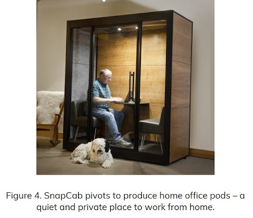 SnapCab is a North American manufacturer of portable glass-and-aluminum privacy pods for use as meeting rooms for the open office.18 When the pandemic hit, small meeting rooms for offices were no longer needed. The company realized that it had the design and manufacturing capabilities to develop medical testing pods for use by healthcare workers, and so designed and developed several prototypes, and is now bringing a final product to market. But SnapCab’s pivot didn’t end there. With many people working from home, SnapCab took its traditional pod product and redesigned it into an individual home-office pod – a mini-home office to provide privacy and quiet (Figure 4). In addition, the firm developed the “Consult”, a two-person pod designed with a glass partition to provide a safe place for face-to-face meetings. This Consult has been coined the “God Pod” for its use for private two-person meetings in a church.